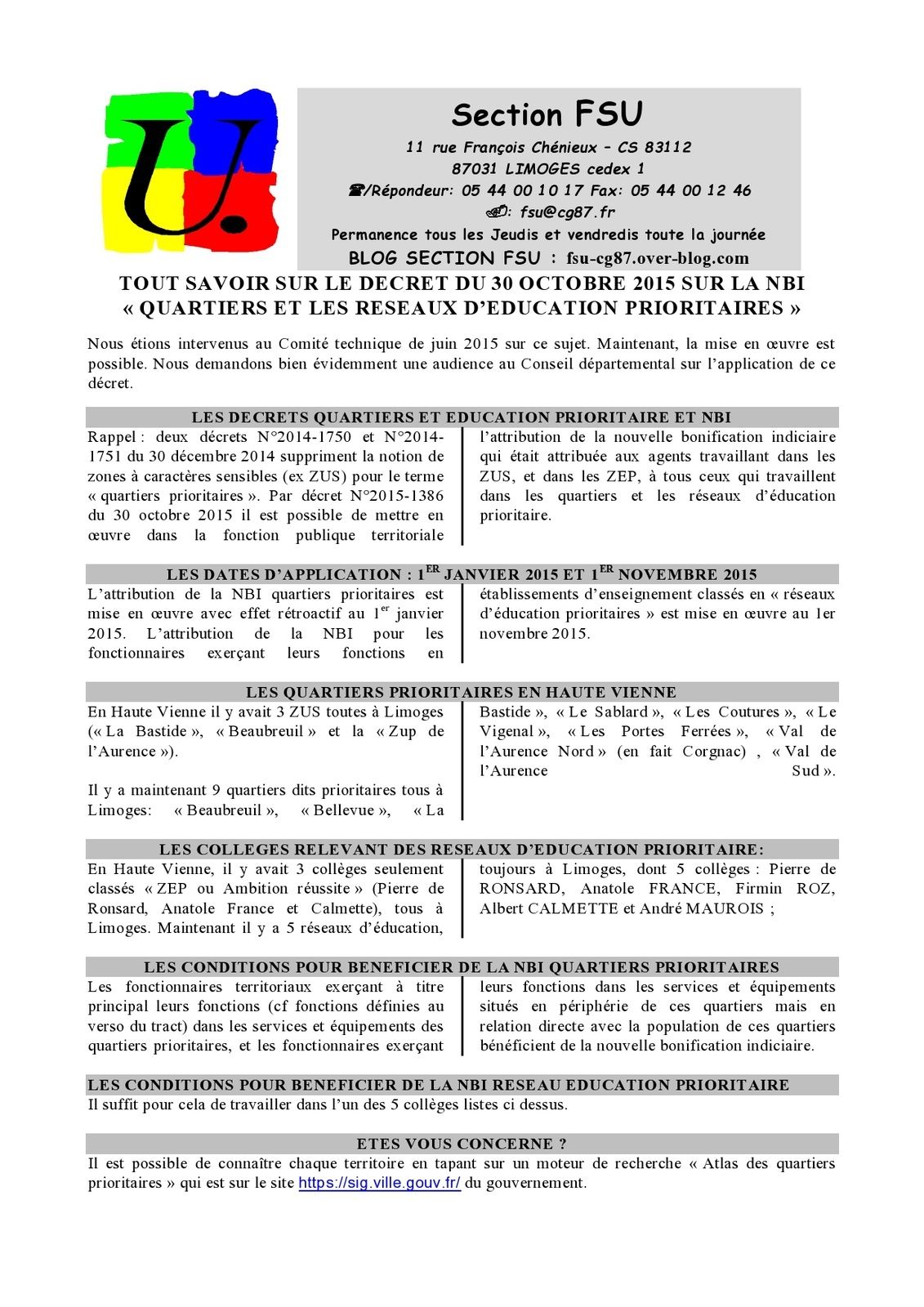 TOUT SAVOIR SUR LE DECRET DU 30 OCTOBRE 2015 SUR LA NBI « QUARTIERS ET LES RESEAUX D’EDUCATION PRIORITAIRES »